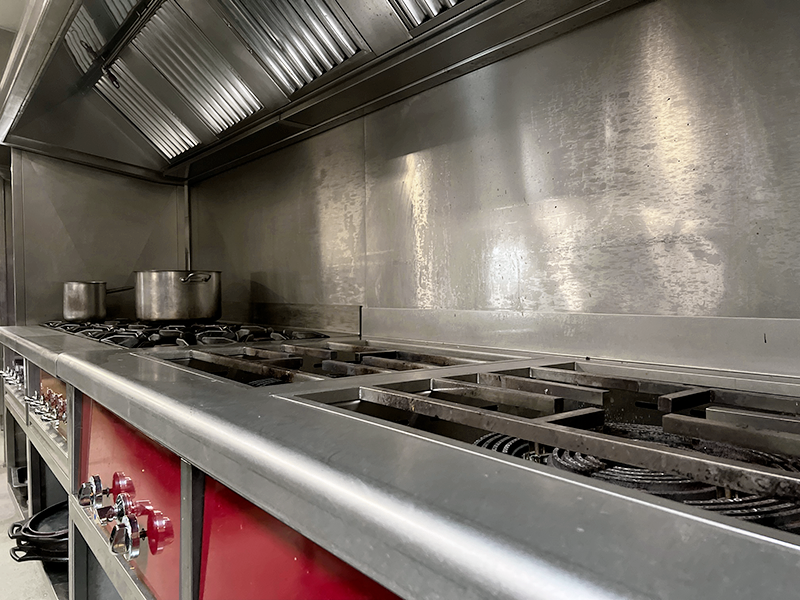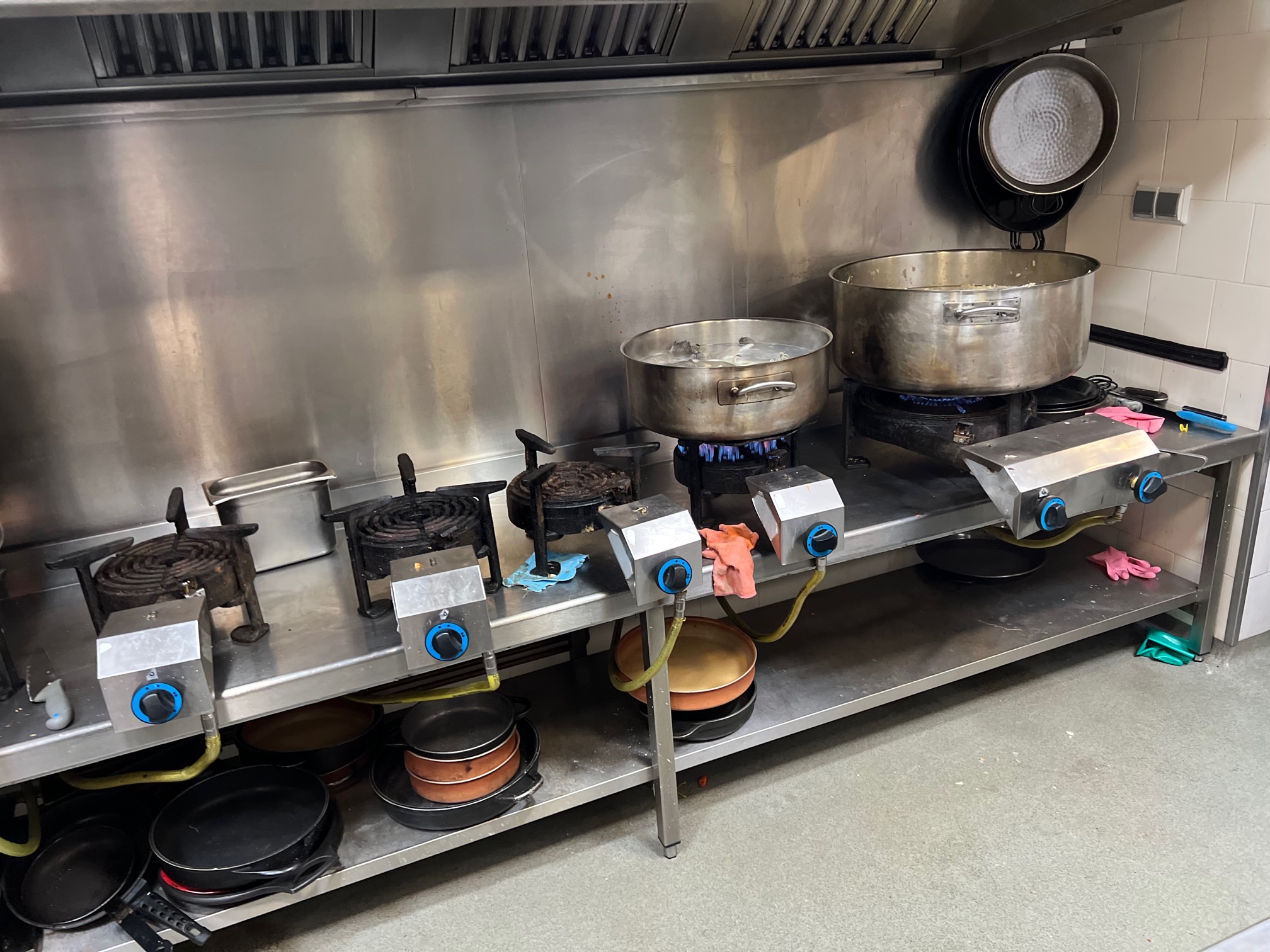 Reforma zona cocción en camping Los Manzanos con 2 cocinas de 4 fuegos con circuito de agua de Charvet y 2 paelleros de 27 KW de potencia con circuito de agua a medida.