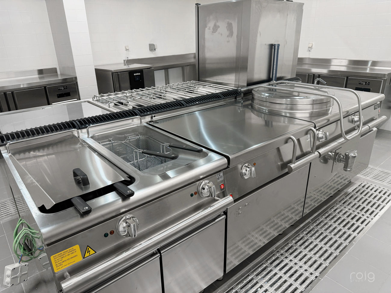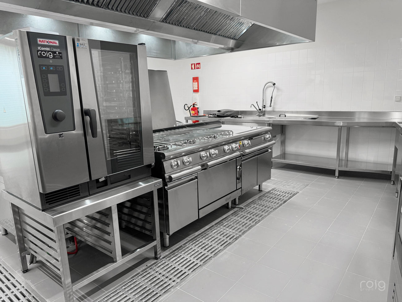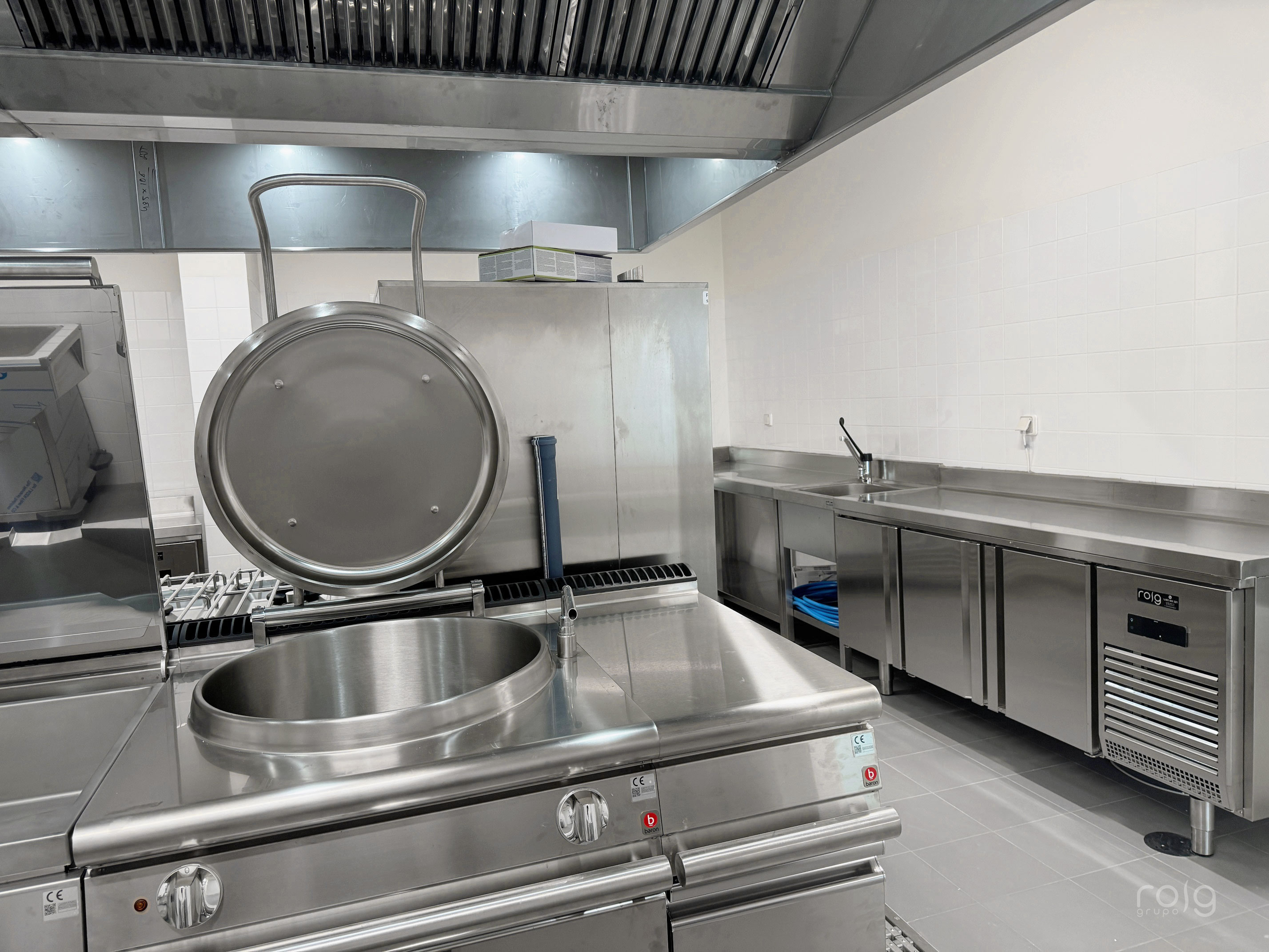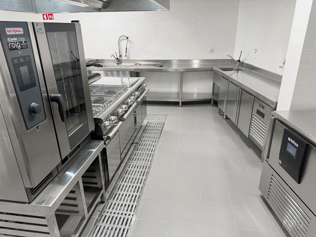 La residencia cuenta con varias zonas de trabajo, en la cocina hemos instalado un bloque de cocción de Baron Professional compuesto por una sartén basculante, marmita, freidora 2 senos, fry-top cromo-duro y cocina de 6 fuegos de gran rendimiento y circuito de agua para facilitar la limpieza. También hemos equipado un horno mixto Rational modelo Icombiclassic de 10 bandejas GN 1/1 para las producciones y cocciones a baja temperatura.