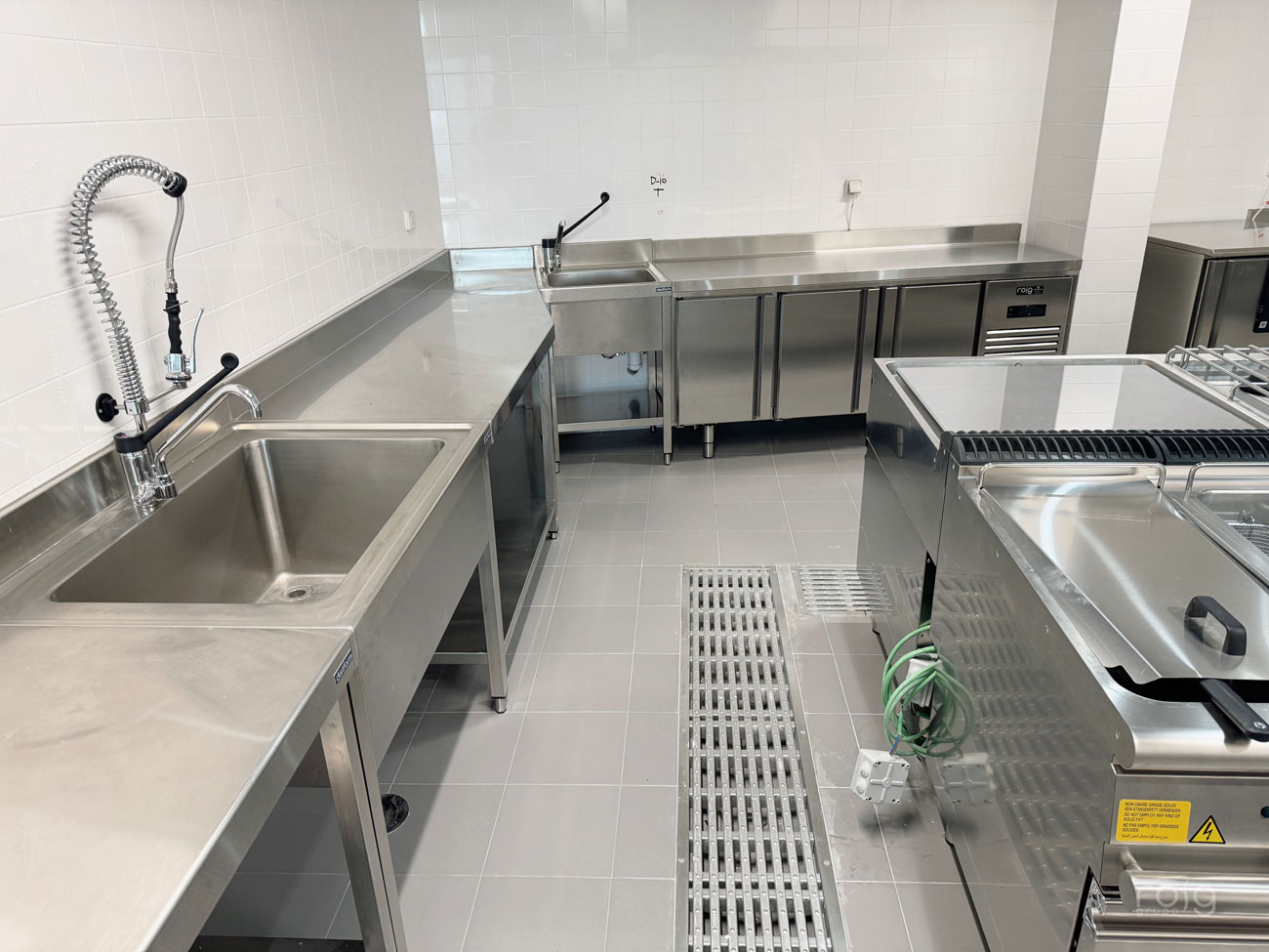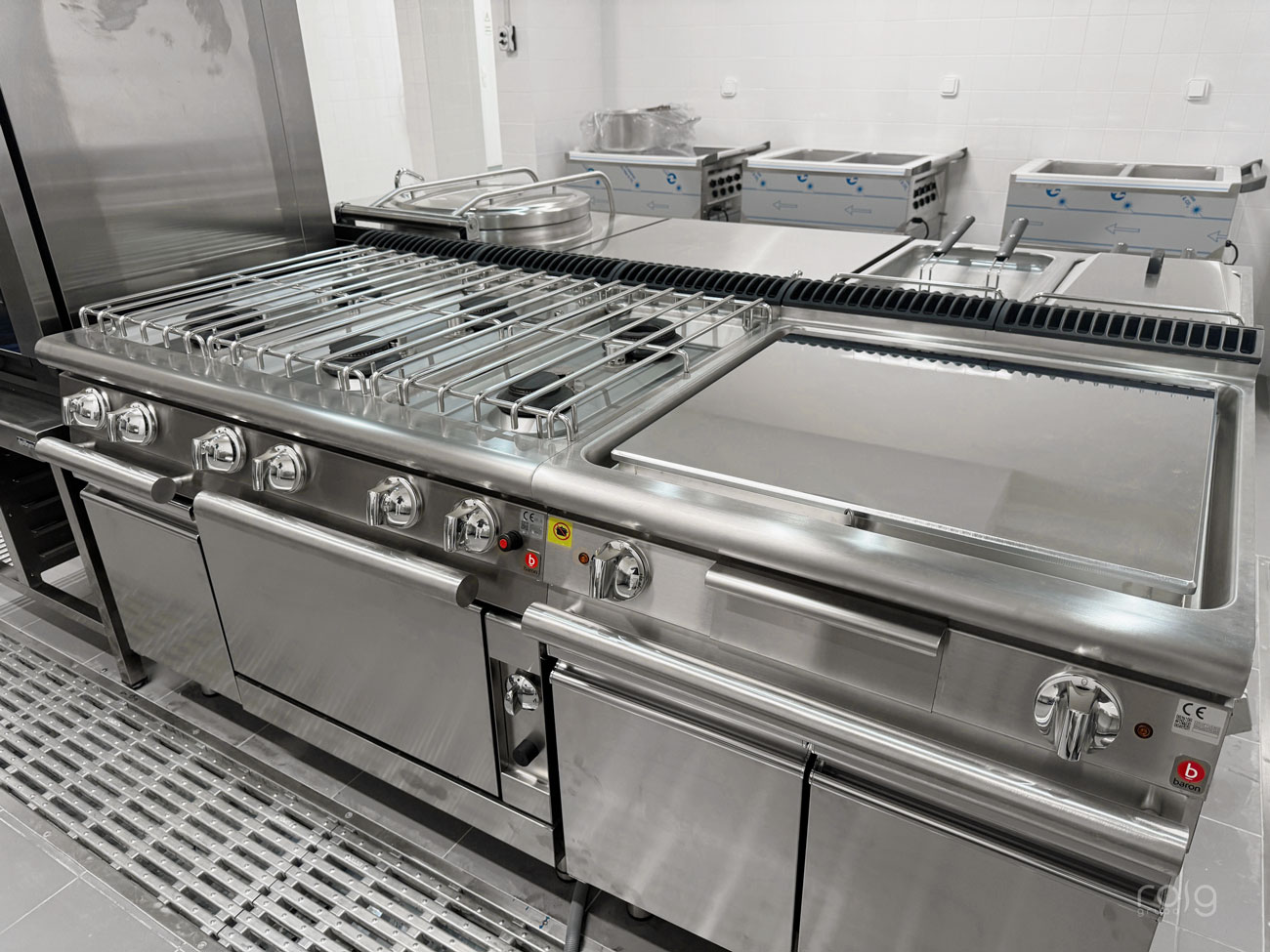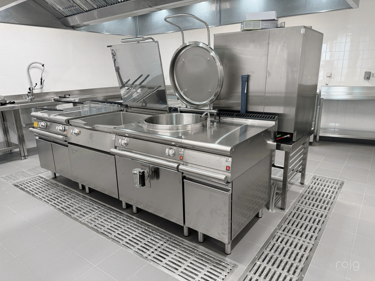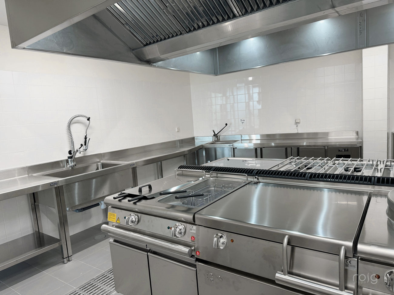 La residencia cuenta con varias zonas de trabajo, en la cocina hemos instalado un bloque de cocción de Baron Professional compuesto por una sartén basculante, marmita, freidora 2 senos, fry-top cromo-duro y cocina de 6 fuegos de gran rendimiento y circuito de agua para facilitar la limpieza. También hemos equipado un horno mixto Rational modelo Icombiclassic de 10 bandejas GN 1/1 para las producciones y cocciones a baja temperatura.