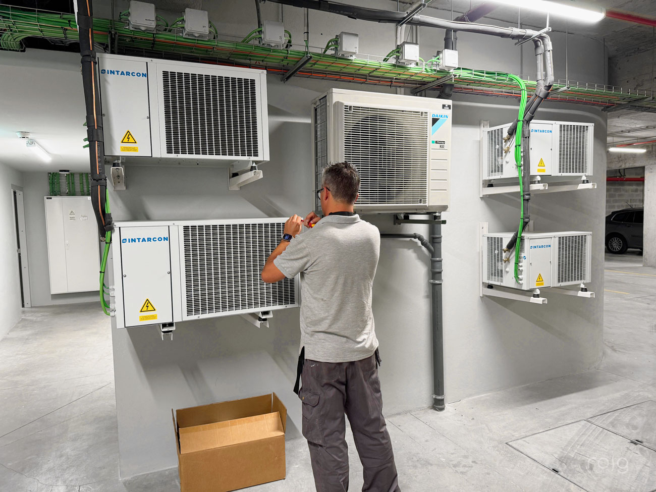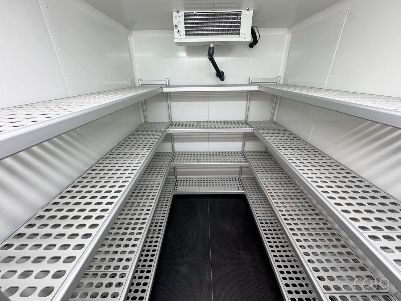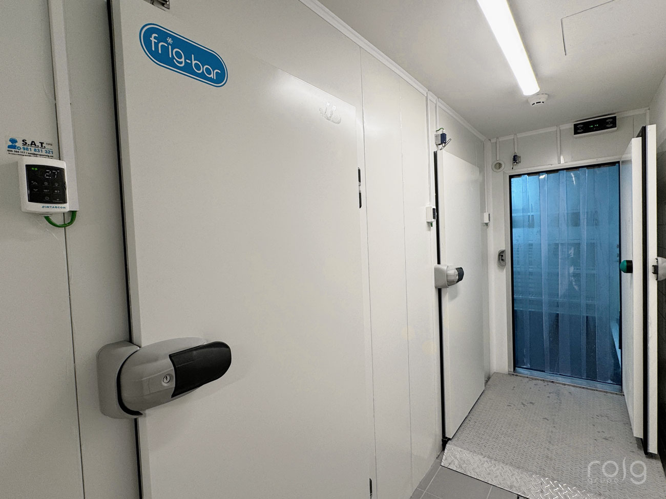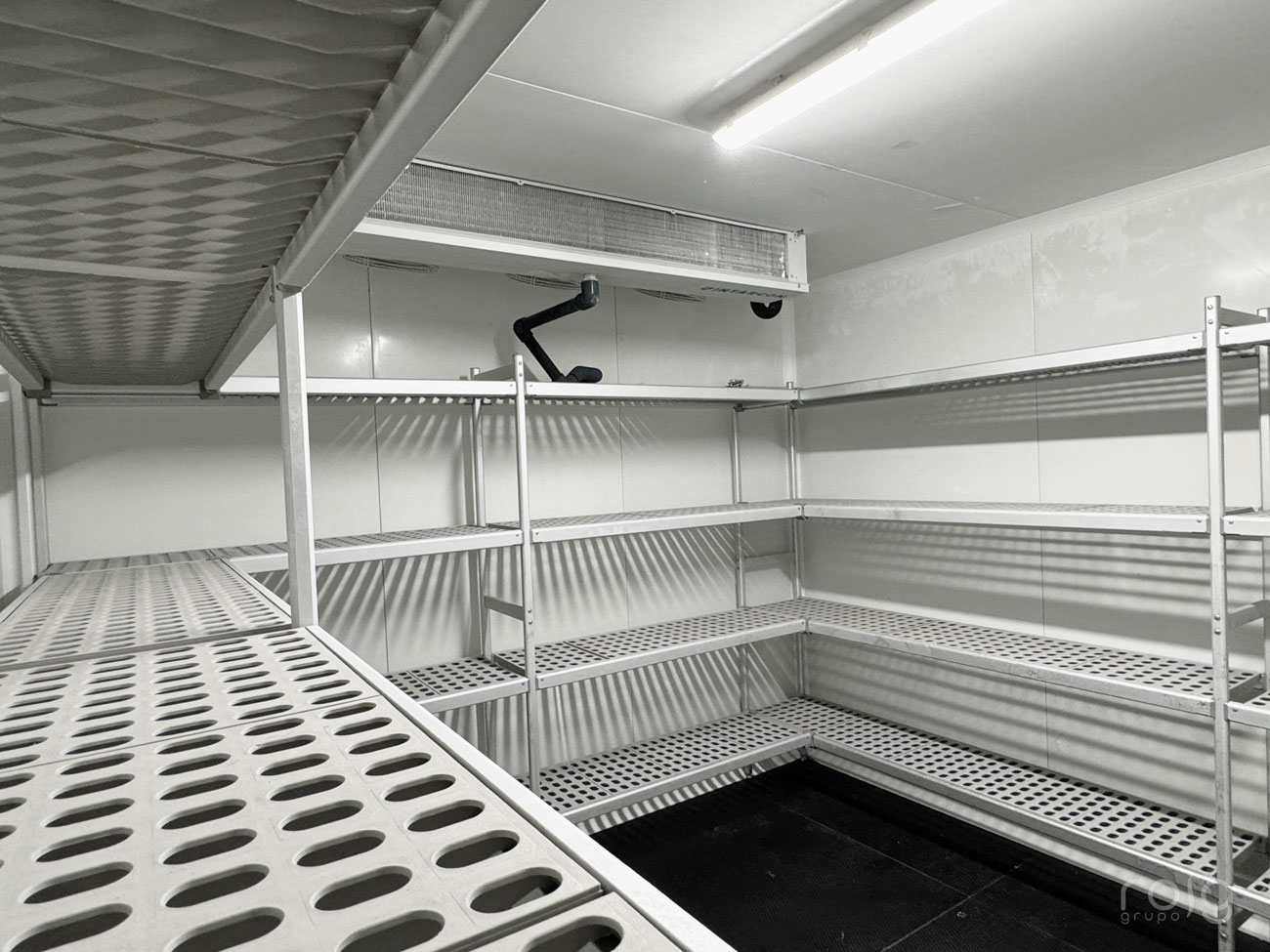 Las cámaras frigoríficas cuentan con 2 recintos de conservación de producto a +3ºC y un recinto de congelación a -18ºC, ambos llevan los motores a distancia en la zona de parking ubicado en la parte inferior del edificio a una distancia de 30 metros. Para ello hemos realizado el cálculo necesario de potencia, sifones e instalación de tubería frigorífica con soportación a techo y calorifugado de tubería frigorífica. Destacamos del conjunto de cámaras la integración del panel con la obra, aprovechando la altura del almacén y cerrando a techo con perfilería sanitaria; además las estanterías de aluminio son medidas con exactitud y con los ángulos de 90º abiertos para mejorar las tareas de limpieza y carga de producto.