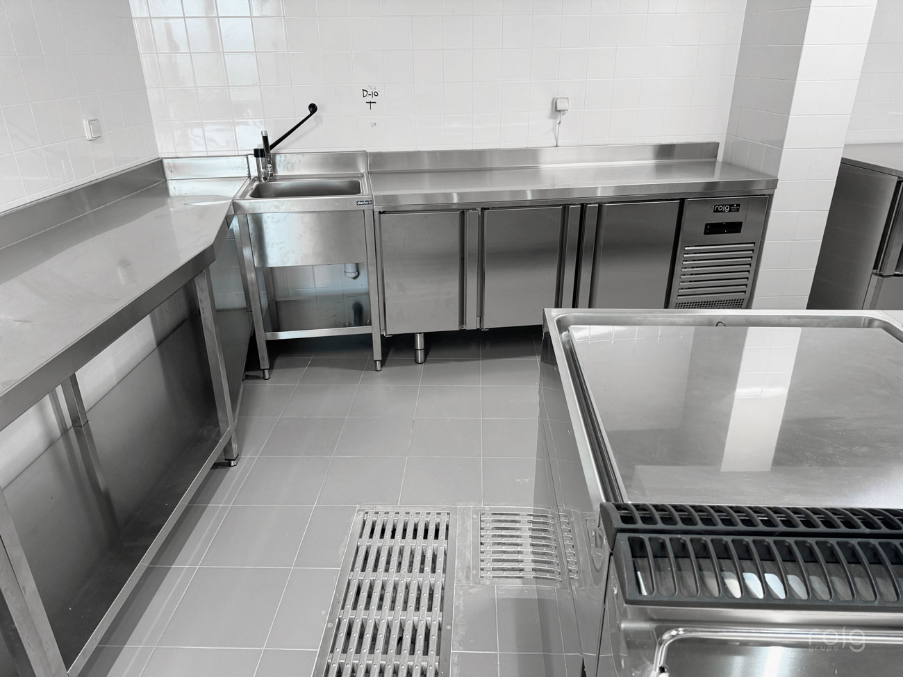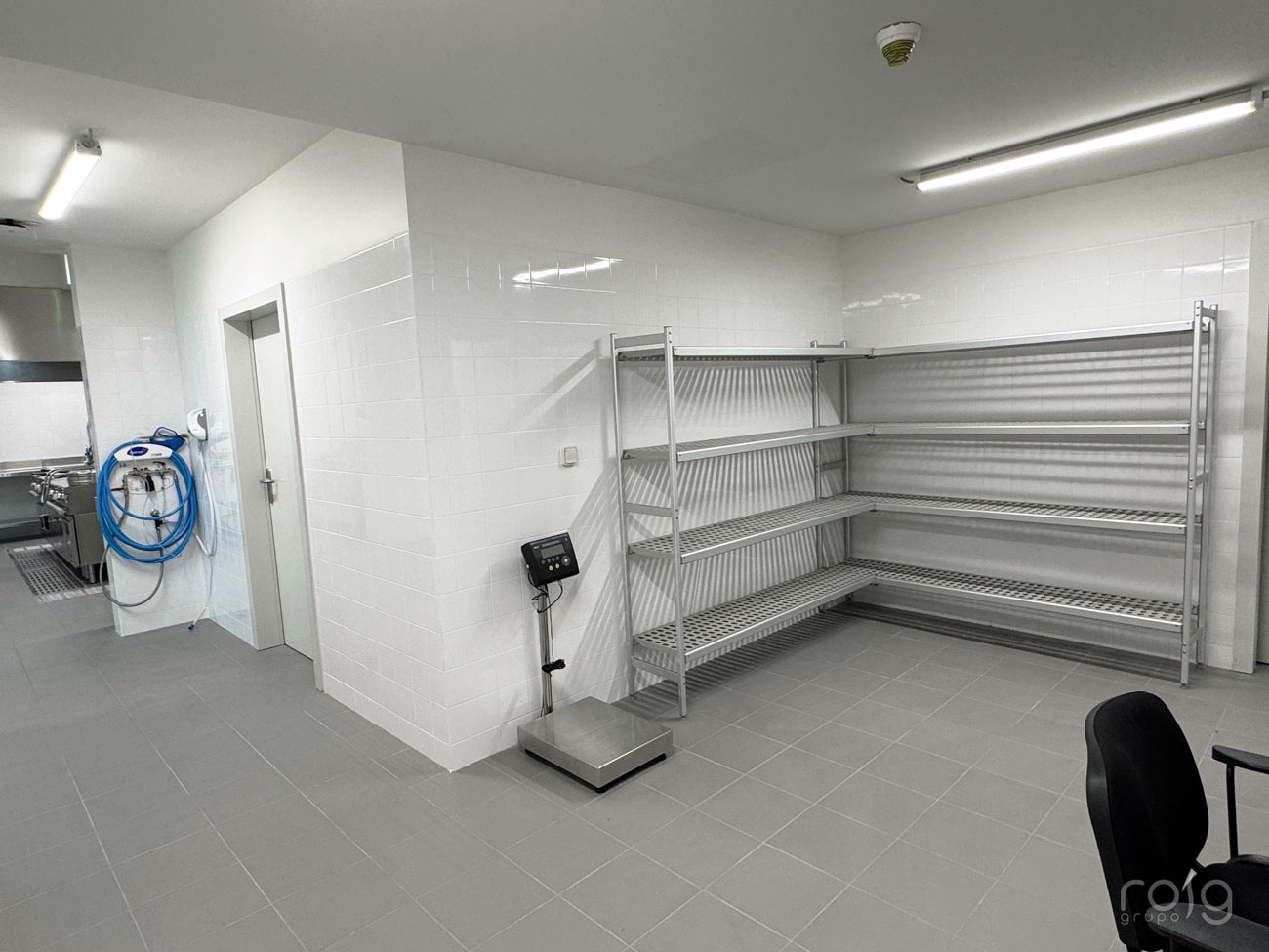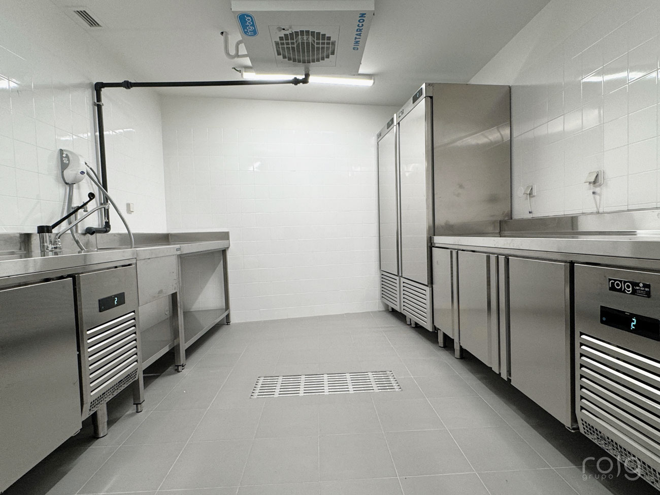 Entre la cocina y las cámaras frigoríficas se encuentra el cuarto frío, climatizado a +13ºC ideal para mantener la cadena de frío y evitar la proliferación bacteriana durante la preparación de alimentos. El equipamiento de este espacio cuenta con peladora de patatas de la firma Sammic, armarios refrigerados gastronorm GN 1/1 y mesas frías de la marca Infrico, para conservar los alimentos ya procesados a +3ºC con sus correspondientes mesados y fregaderos en acero inox para la preparación de alimentos. El equipo de frío instalado es un evaporador central de la marca Intarcon, con unidad exterior a distancia de 30 metros y con capacidad para refrigerar un obrador de 60 m3.