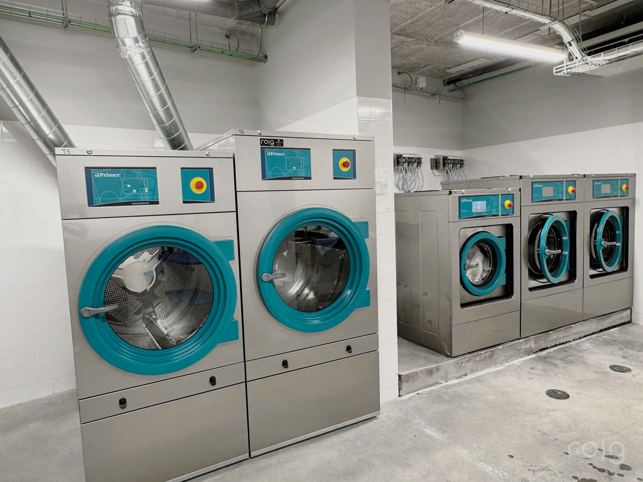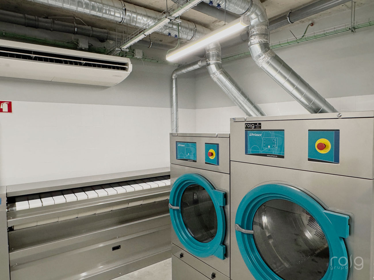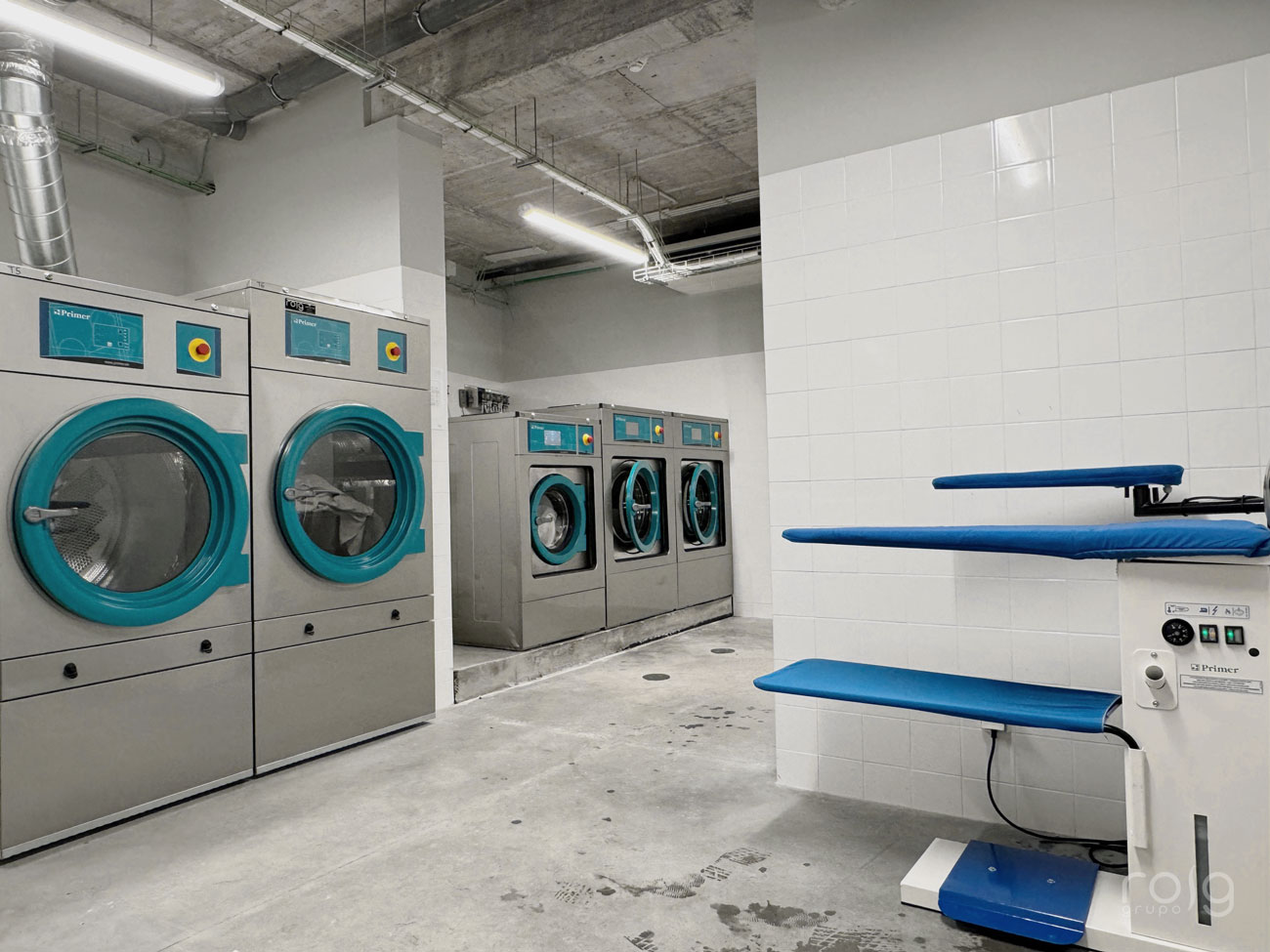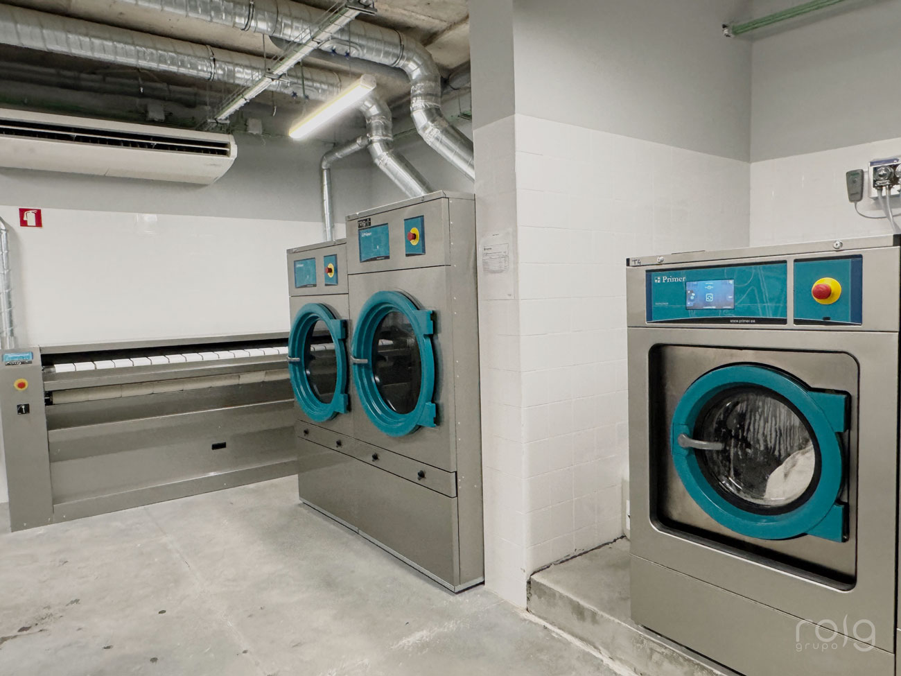 En la planta inferior del edificio se encuentra la lavandería, en la que hemos instalado equipos de la firma Primer compuesta por 3 lavadoras de 22 Kg y 14 Kg de carga, 2 secadoras de 22 Kg de carga, una calandra mural de 2 metros de longitud y la correspondiente mesa de planchado y repaso para las prendas más delicadas.
