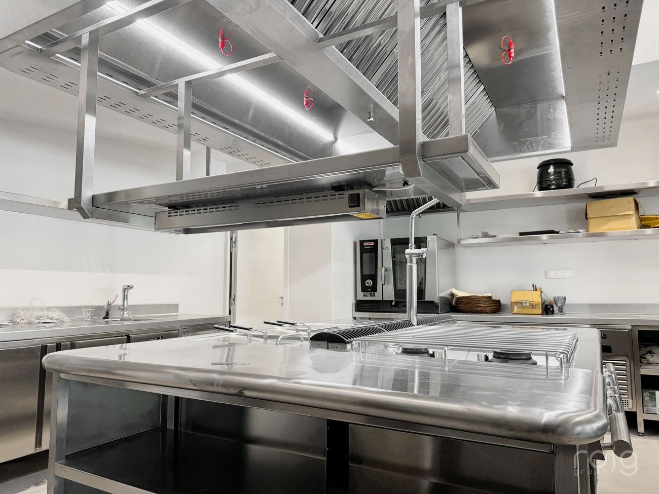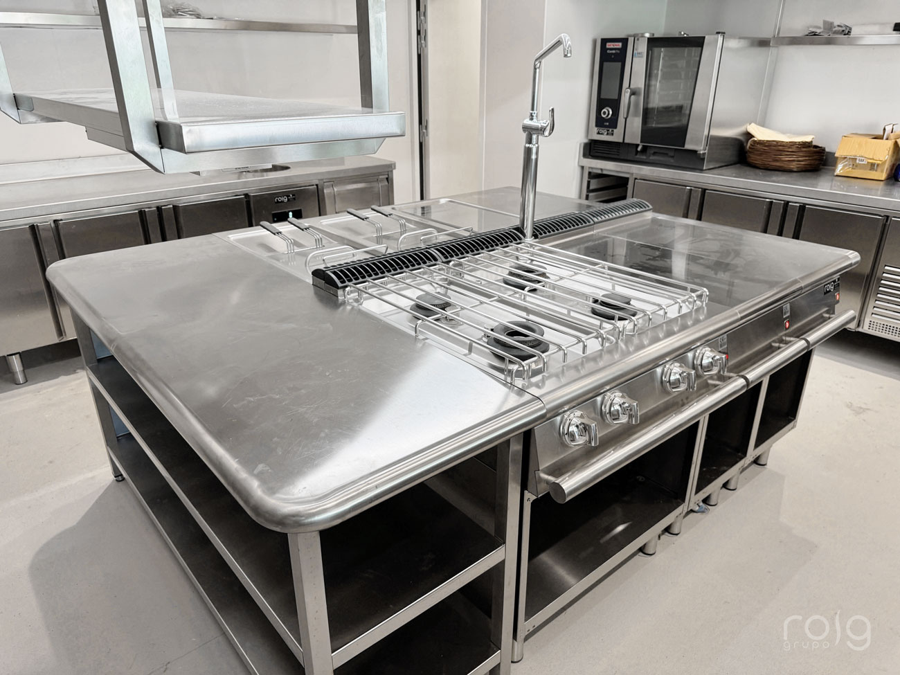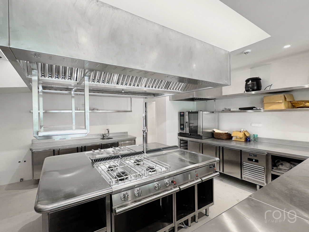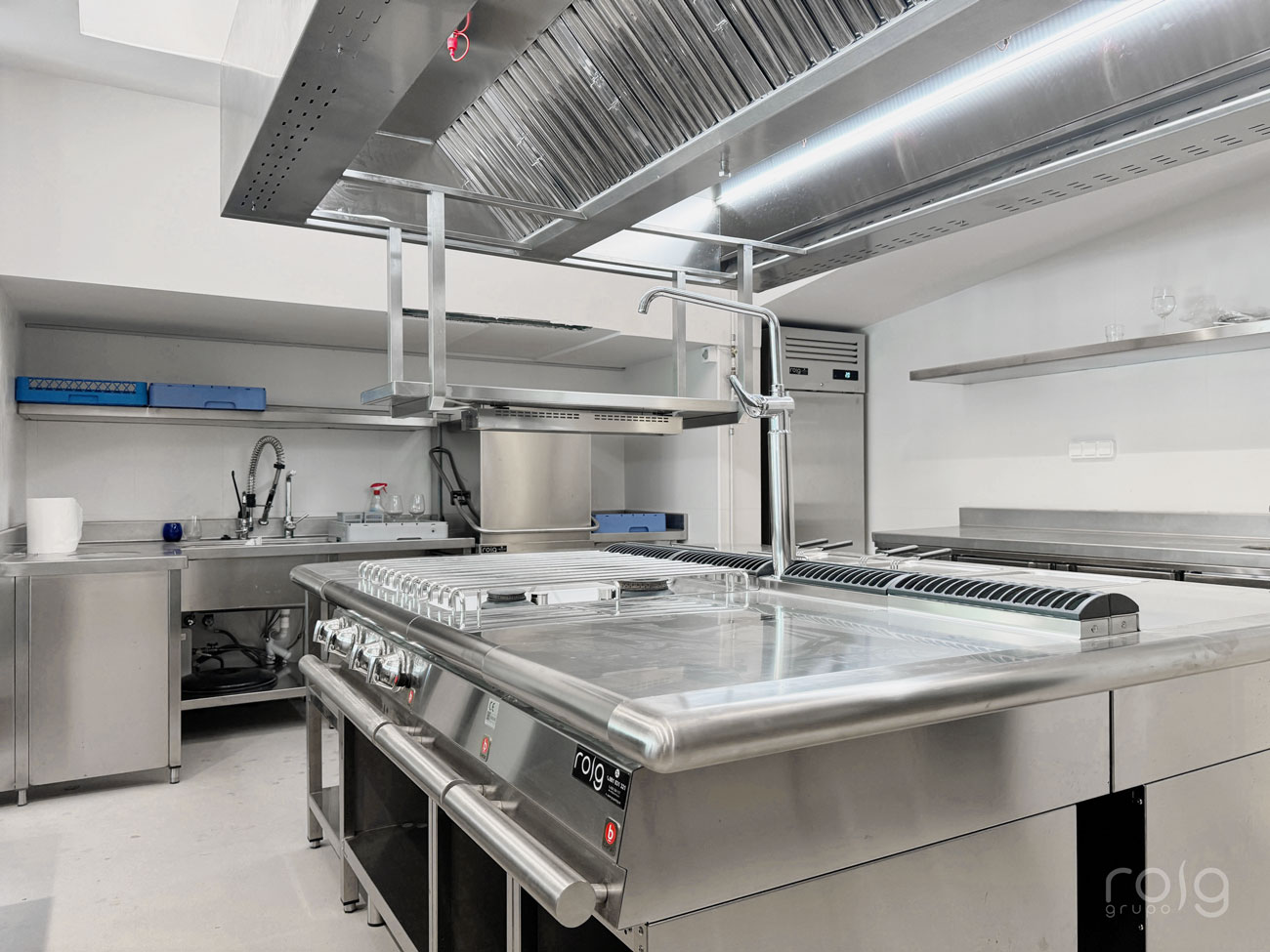El sistema de extracción cuenta con una campana central fabricada a medida con aportación de aire inductora haciendo cortina de aire vertical y garantizando una buena extracción y compensación del aire. En la zona de campana, hemos fabricado un estante calienta platos soldado directamente a la campana, dejando el mesado de trabajo completamente libre para el emplatado