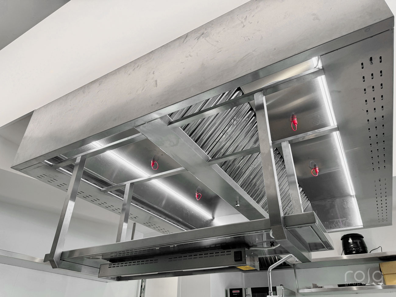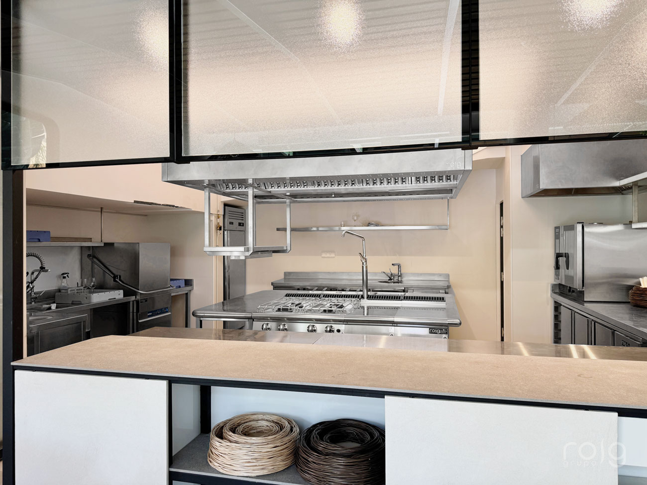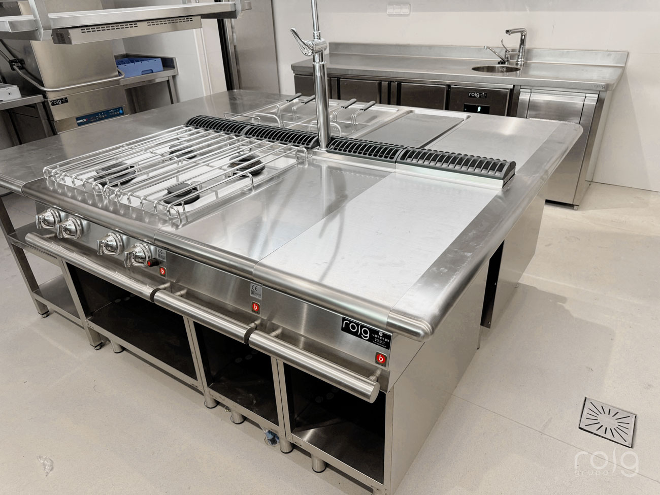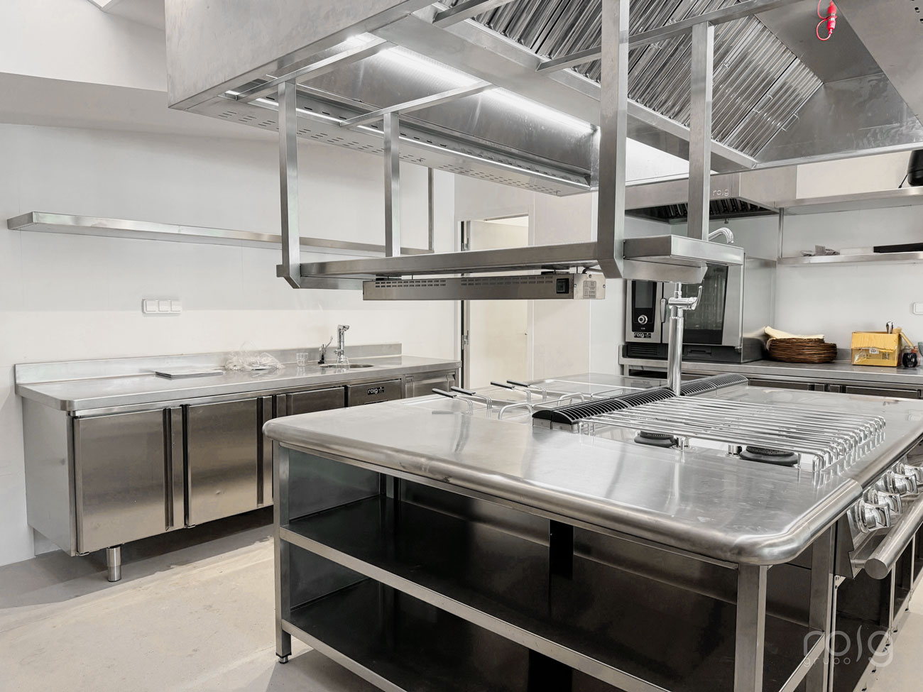 El sistema de extracción cuenta con una campana central fabricada a medida con aportación de aire inductora haciendo cortina de aire vertical y garantizando una buena extracción y compensación del aire. En la zona de campana, hemos fabricado un estante calienta platos soldado directamente a la campana, dejando el mesado de trabajo completamente libre para el emplatado