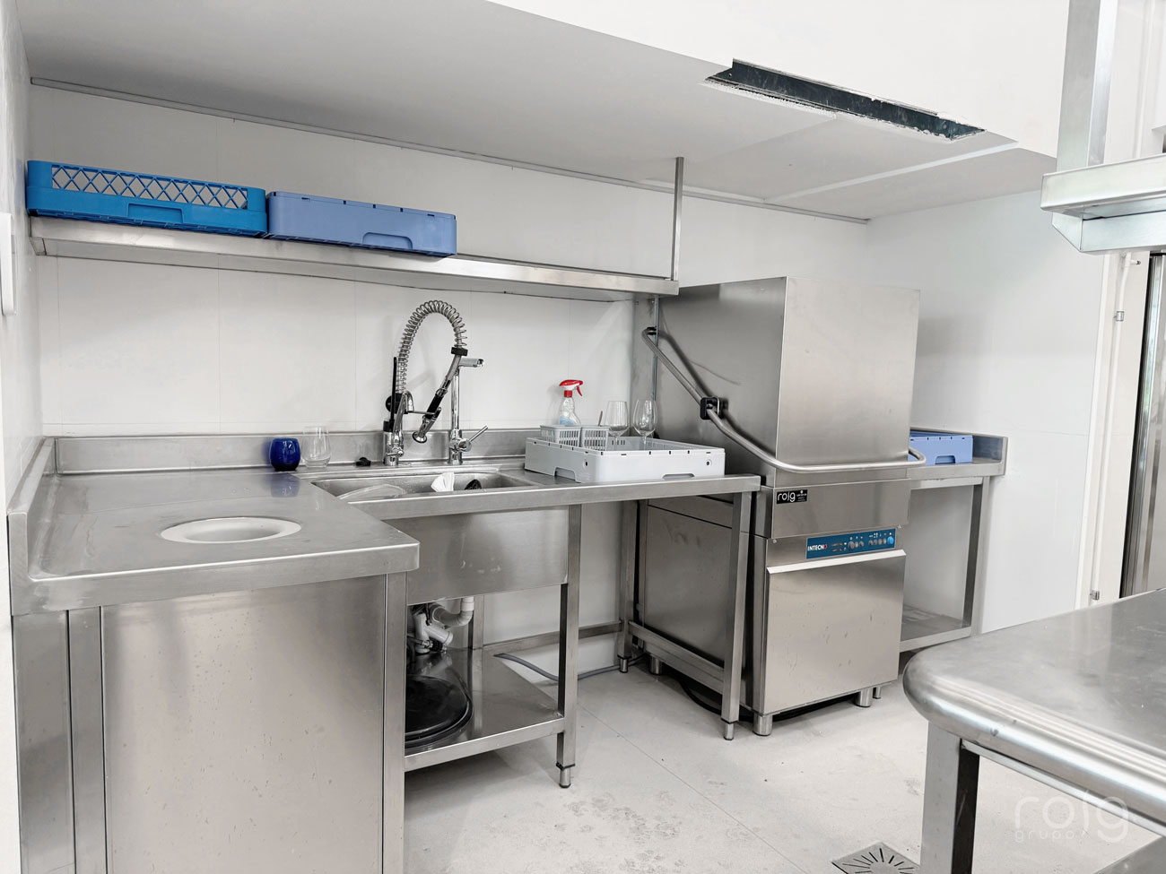 La zona de lavado cuenta con una lavavajillas de capota de la firma Intecno, ideal para el lavado de platos y utensilios de cocina, con sus correspondientes mesados en acero inoxidable para el prelavado de vajilla y salida de cestas ya higienizadas.