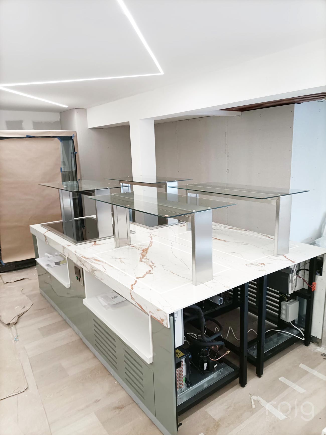 • Mesas Frías de Diseño: Instalación de mostradores y mesas de buffet refrigeradas de diseño, con acabados en mármol de vetas doradas y estructuras en acero inoxidable pulido. Estas unidades no solo mantienen la calidad de los alimentos y bebidas, sino que se integran a la perfección con el lujo del entorno.