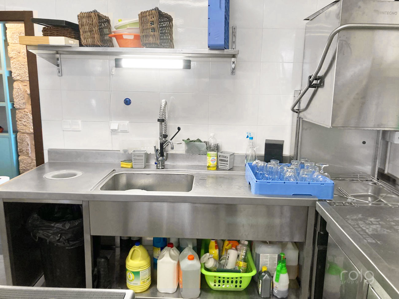 La zona de lavado se resolvió con un lavavajillas de capota Intecno. Es uno de los equipos de nuestra marca asociada con mayor rendimiento en servicio intensivo. Además, completamos esta zona con un fregadero a medida en acero inoxidable y una encimera con cubeta para residuos, también fabricados en nuestro taller.