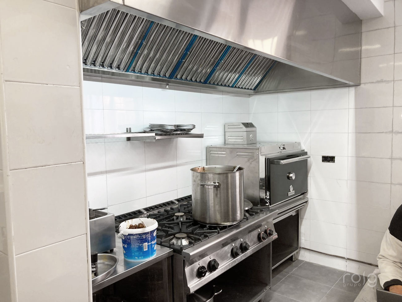 El elemento más destacado del proyecto es el horno de brasa Josper. Es uno de los equipos de cocción más valorados en la hostelería profesional. Además, aporta un acabado y un sabor difíciles de igualar. Para complementarlo, instalamos una campana extractora a medida en acero inoxidable, diseñada específicamente para este equipo.