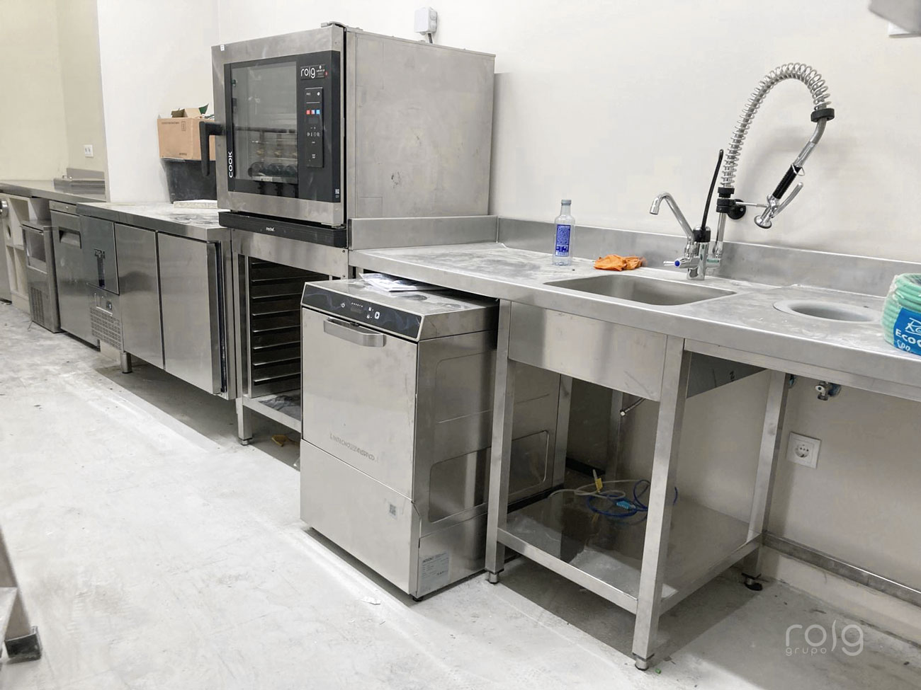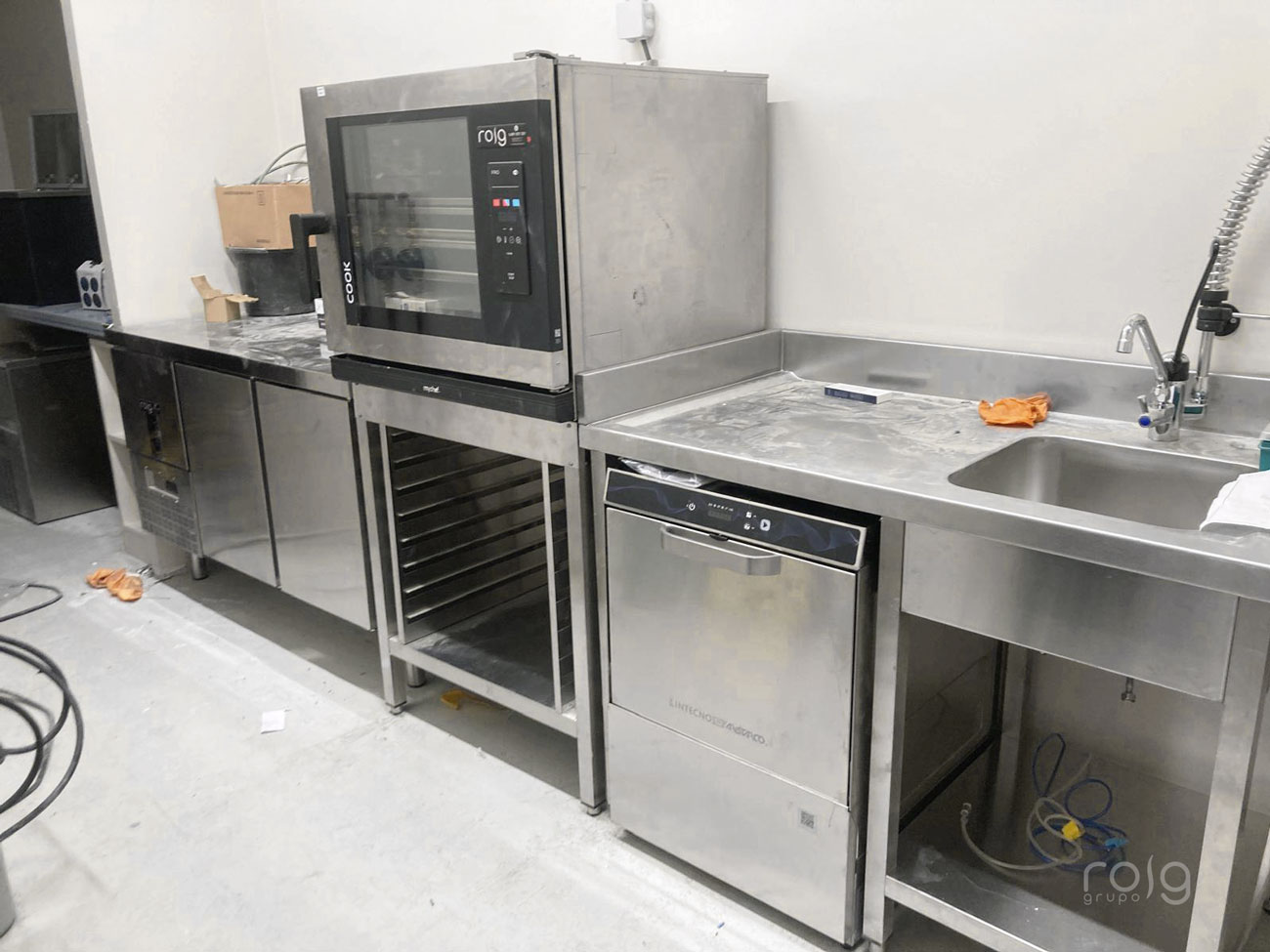 El obrador se equipó con un horno de convección Mychef sobre pie con estantería portabandejas, que permite trabajar con precisión tanto en elaboraciones de cocina como en producción de panadería o pastelería. Junto a él, instalamos un lavavajillas profesional Intecno bajo encimera, situado en la misma línea de trabajo para optimizar los flujos internos.